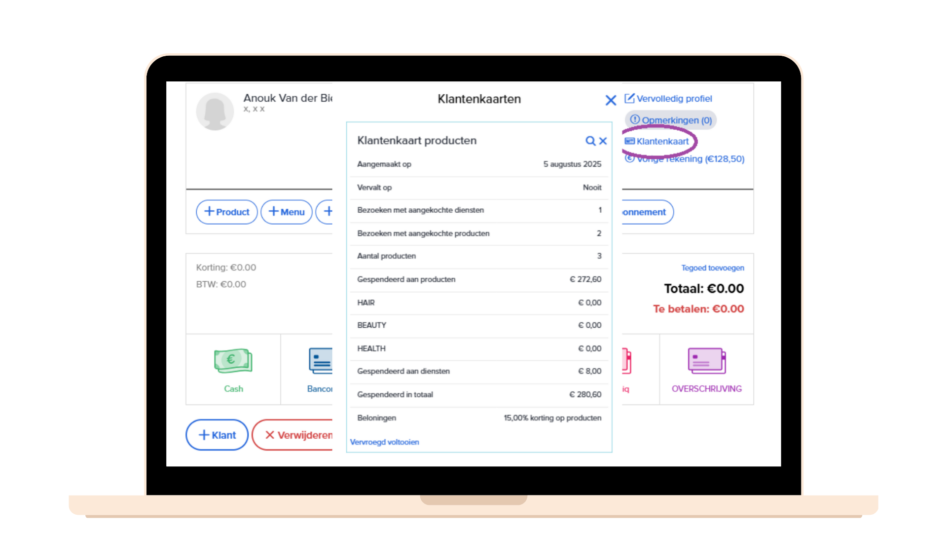 👉 Via de klantenkaart kies je of klanten sparen voor korting na een vast aantal beurten, een bepaald bestedingsbedrag of op basis van specifieke producten. Je kan er zelfs voor kiezen dat klanten bij élk bezoek een extraatje krijgen. Alles wordt automatisch verwerkt aan de kassa – zonder manueel werk.